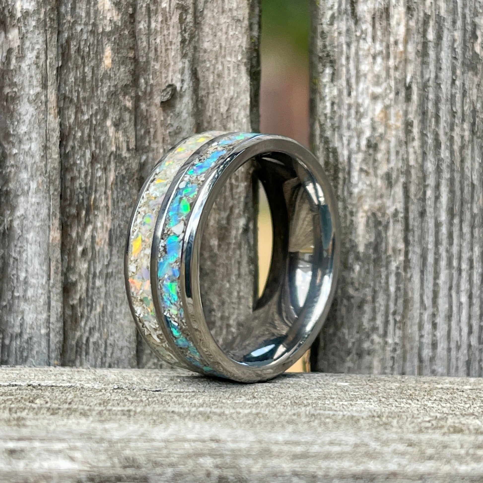 💎 8mm Tungsten, Titanium or Sterling Silver Dual Channel Cremation ring. Customizable with your choice of elements. I offer the option to add opals, and/or glow powder for added interest. You may allocate each channel with a different set of ashes and/or opal/ glow options to your liking. With the glow options, the ring will glow after being exposed to natural sunlight. After you place your order you will receive an email confirmation with the address and instructions for sending your loved ones ashes. Your ring will arrive in a ring box for safe traveling and safekeeping. I will mail back any remaining unused ashes. If you selected the option to have opals included, please let me know in the Note to Seller which color opals and/or glow you'd prefer according to the color chart in the photos.